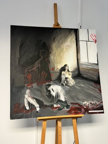 Je to hodně rozmanité. Ne jen malba. V prváku nás učí hlavně základy – barvy, techniky, kompozice, ale taky hromadu času kreslíme, což mě štve, protože radši maluju. Máme grafiku, učíme se i písmo – kvůli tradici, freskám, historickým malbám a restaurátorství. Učíme se o nejrůznějších materiálech, technologiích, pigmentech a pojidlech. Není to jen malba, ale je to největší část. Učitelé ví, že prosadit se čistě jako malíř je dnes velmi těžké, takže nás učí i digitální věci. To mě ale nebaví – radši si potřísním ruce barvou.