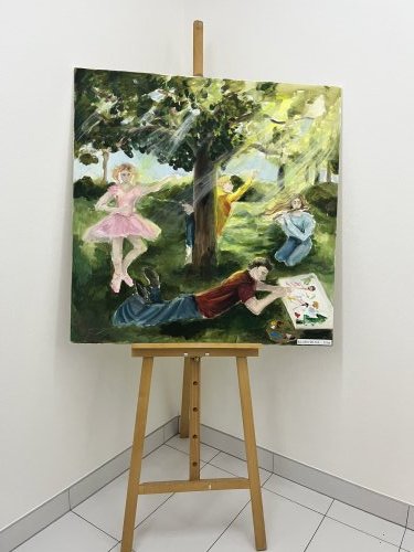 8, Mezi tvými pracemi na výstavě pro firmu Euregnia mě zaujal jeden obraz, který zachycuje čtyři obory naší školy – hudební, výtvarný, taneční a dramatický – propojené kolem stromu, v přírodě a krásném světle. Můžeš mi o něm něco říct?