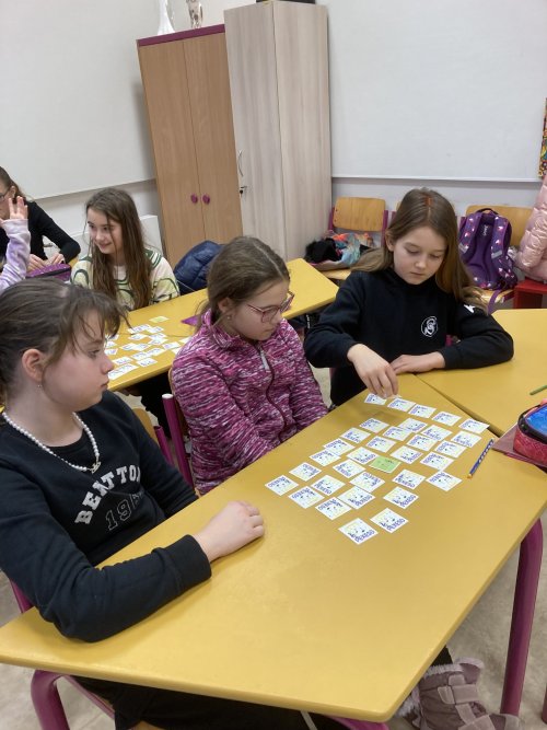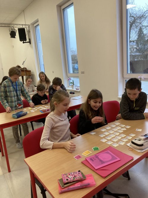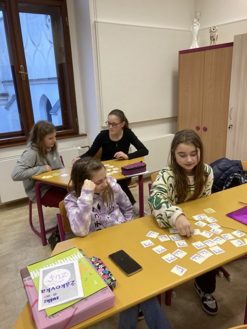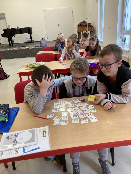 SRPŠ zakoupilo pro žáky hudební nauky pexeso s tématem not. Tato hra je blízká všem generacím dětí, pravidla se samozřejmě nemusela vysvětlovat (ukrajinská žákyně tuto hru neznala). S radostí se hry ujaly nejen nižší ročníky, ale také žáci ročníku pátého, u kterého jsem čekala spíše odmítnutí nabídky. Hráli s velkým zaujetím, chutí a přirozenou soutěživostí, procvičovali si noty v houslovém klíči, basový klíč jsem zatím odejmula, tuto část pexesa si vzala kolegyně Tokmaková z klavíru, zde jsou tyto noty žádoucí.