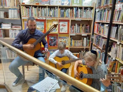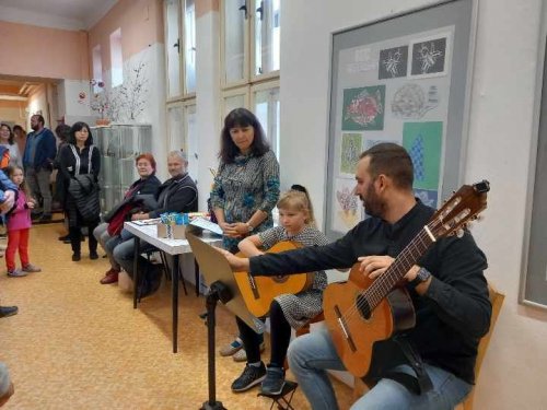 Vernisáž zahájila žákyně I.ročníku kytarového oddělení Marie Kaňovská krátkými skladbičkami spolu s panem učitelem Martinem Deylem.