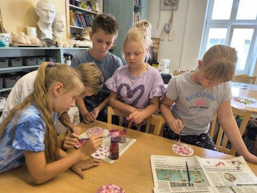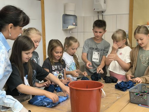 Hned druhý červencový týden patřil výtvarnému táboru Radmily Doskočilové, kde děti vyráběly vlastní filmové klapky, batikovaly, tiskly na trička, přenášely fotografie na tašky a malovaly na plátna. Nezůstalo ale jen u výtvarné práce – tvořily také originální časopis, hrály týmové hry a připravily malá divadelní představení.